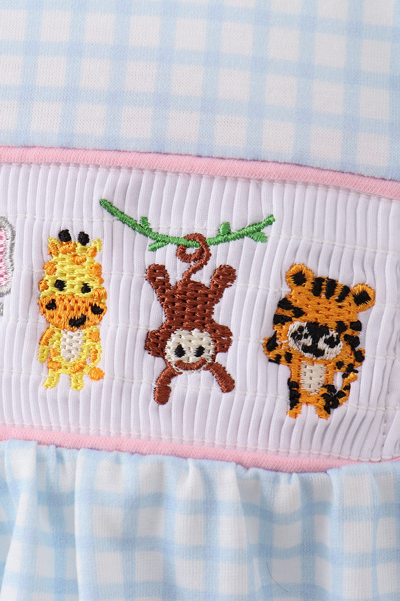 This charming blue animal smocked ruffle bloomer set brings playful style and comfort together. Featuring delightful animal prints with a delicate smocked bodice and flouncy ruffle details, it’s perfect for little adventurers who love to move and explore. Soft, breathable fabric ensures all-day comfort, making it a whimsical choice for sunny days and playtime fun.