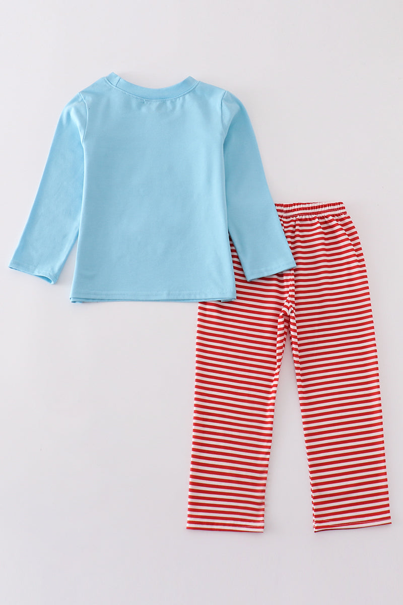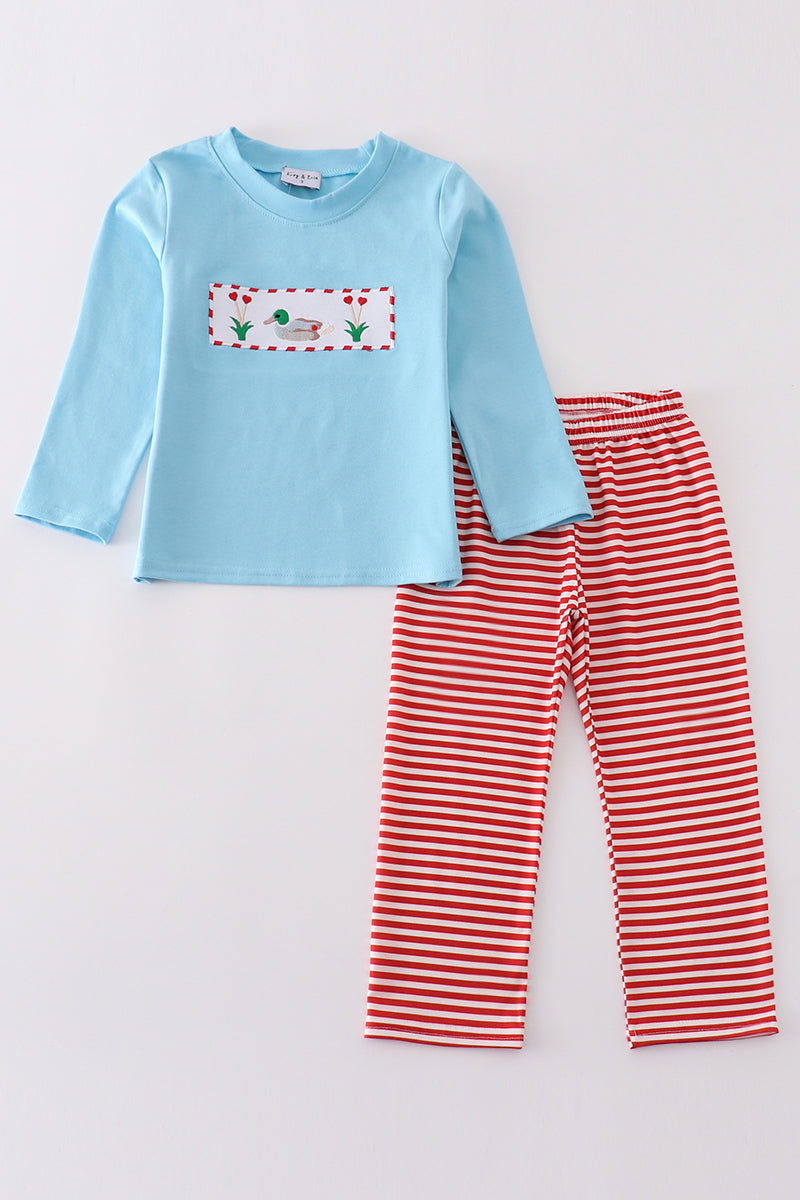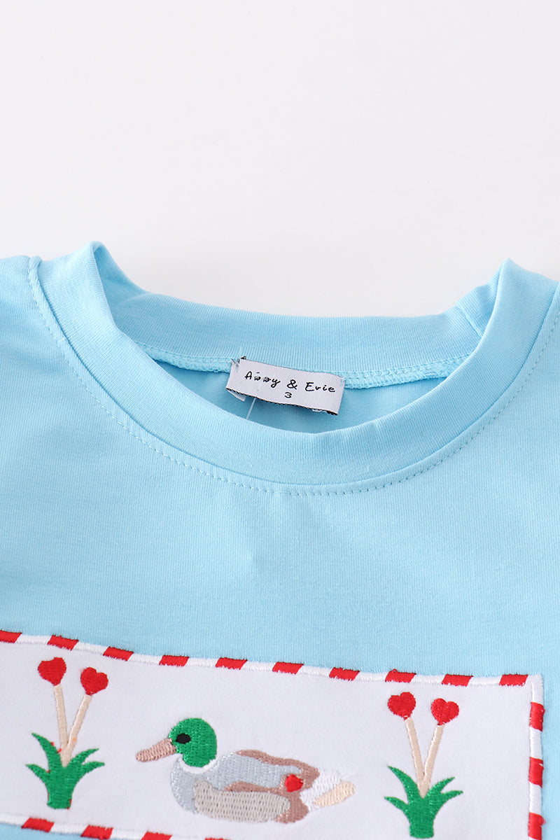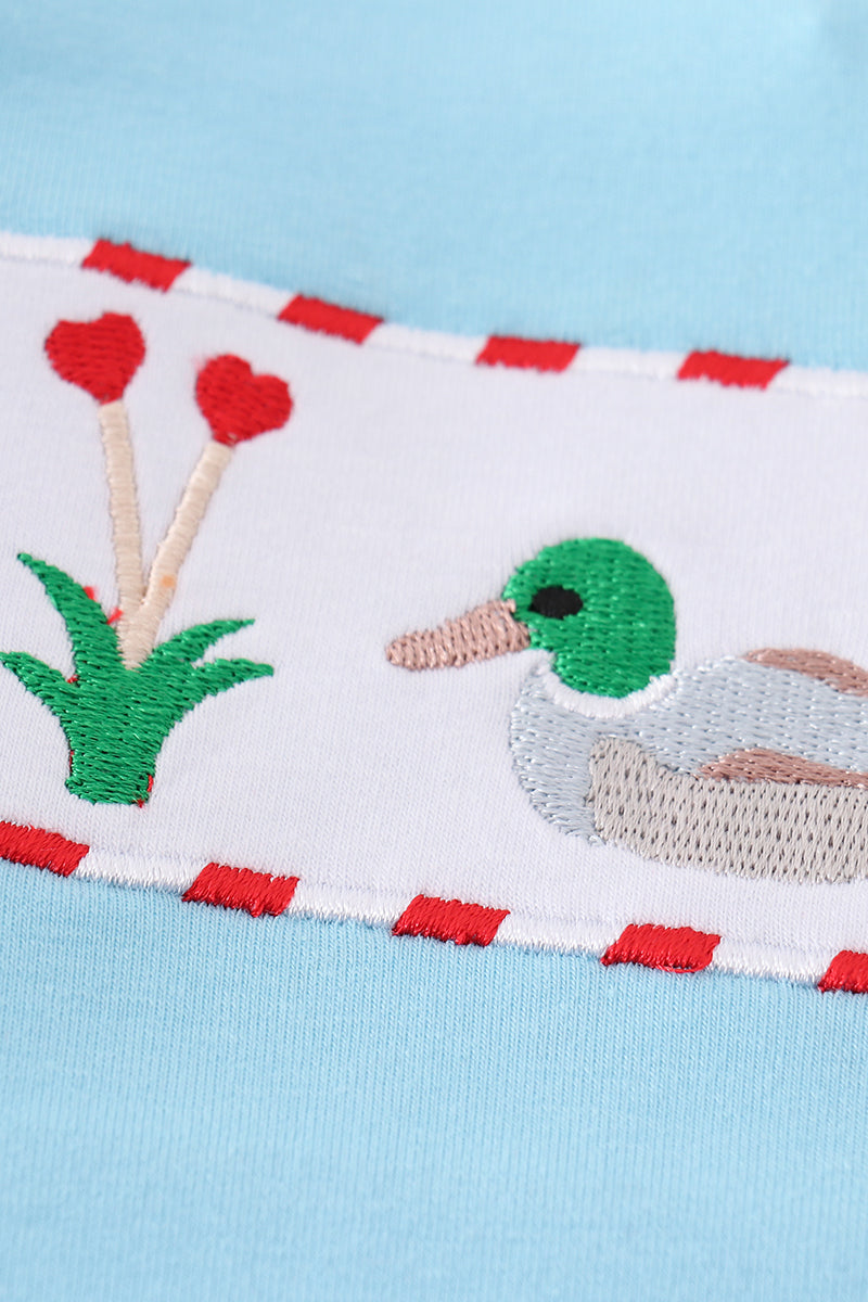 Celebrate Valentine's Day with this adorable blue duck embroidered set for boys! Made with love and care, this set includes a shirt, pants, and a matching beanie, all featuring charming valentine-themed duck embroidery. Perfect for your little one to wear on this special day!