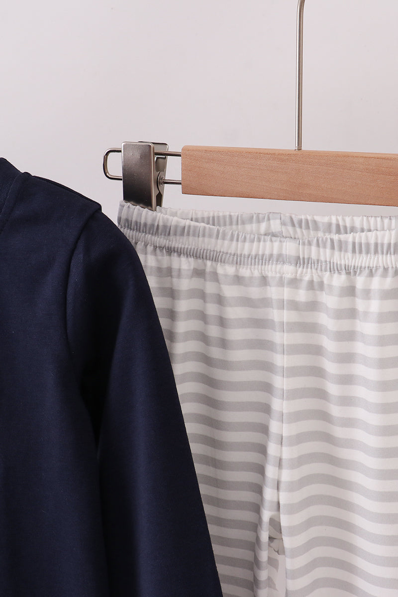 Celebrate the holiday spirit in cozy style with this Navy Christmas Santa Claus Embroidery Stripe Pants Set. Featuring festive Santa embroidery and cheerful stripes, these pants bring playful charm to your loungewear. Perfect for relaxing at home or spreading holiday cheer, the soft fabric ensures comfort while the unique design adds a merry touch to your seasonal wardrobe.